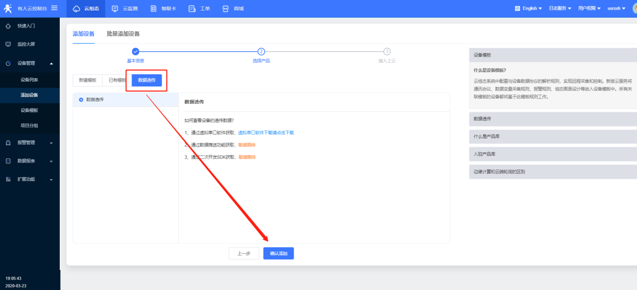 7、选择“数据透传”确认添加。