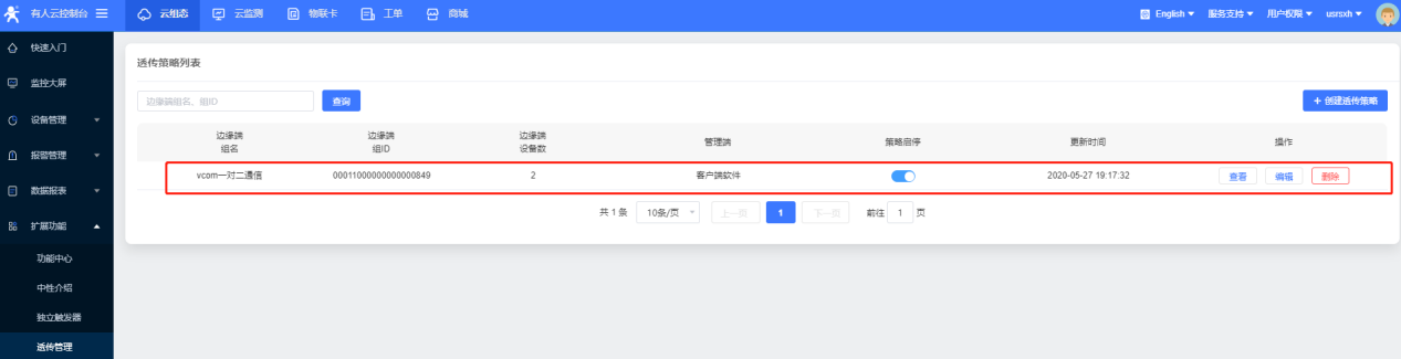 22、点击完成,可以在透传策略列表中看到新创建的透传策略。