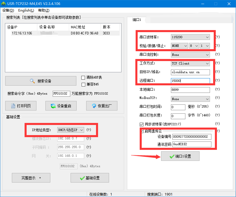 4.设置参数:将工作方式 ,远程服务器地址和远程端口分别设置为:TCp client、clouddata.usr.cn、15000;