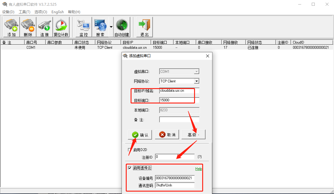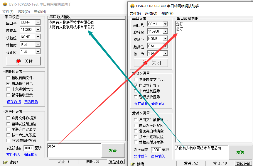 然后用USR-TCp232-TEST测试串口和虚拟串口之间的数据传输。
