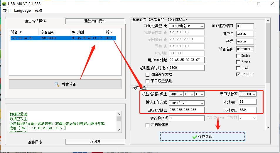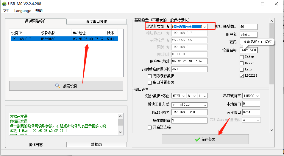 点击“搜索设备”当搜索列表中出现301的设备后,单击搜索到的设备,右边基础设置,在“IP地址类型”将静态IP改为DHCP动态获取,点击保存参数。