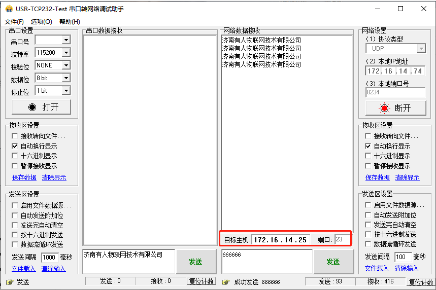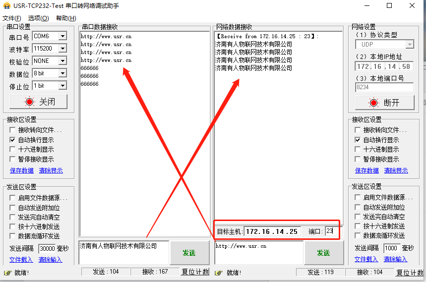 串口数据可经由DR301发往已经建立UDP通信的两台电脑,同样,两台电脑的数据可以经由DR301发往串口,具体测试如下。