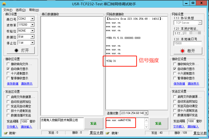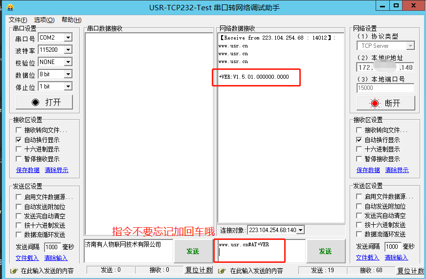 网络AT指令格式:命令密码+AT指令(7S5命令密码默认是www.usr.cn#;指令需要加回车换行)