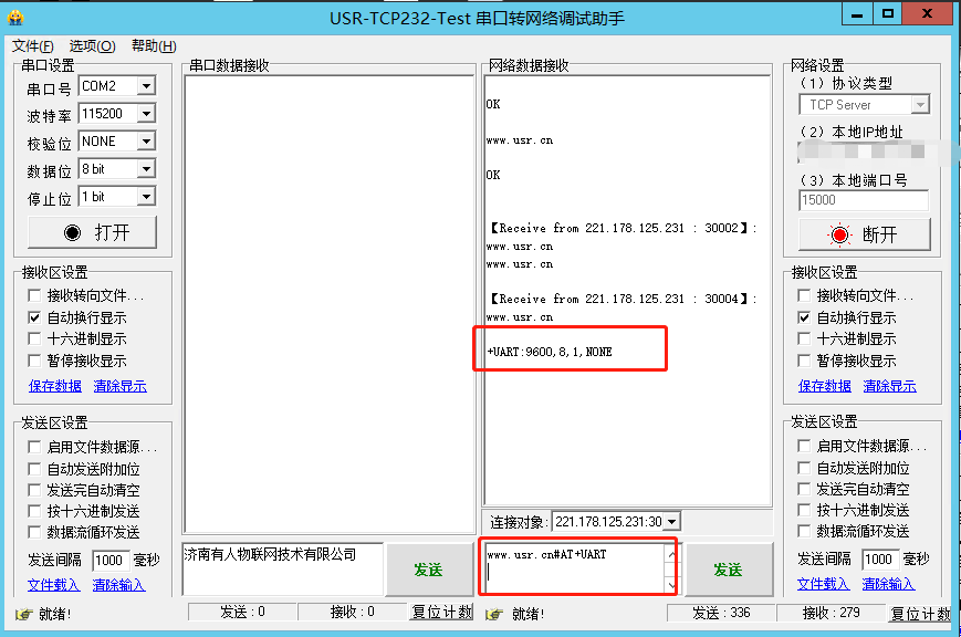 (4)修改模块当前的串口参数,波特率改为9600;返回OK即为设置成功