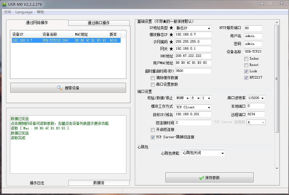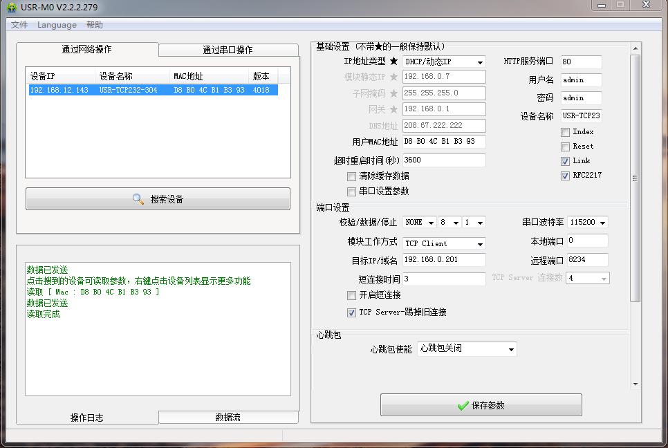 用M0设置软件搜索USR-TCP232-304的IP,192.168.0.7,USR-TCP232-304用设置软件将IP获取方式从静态改为DHCP,动态获取IP。