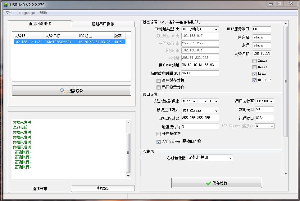 USR-TCP232-304 工作方式UDP 目标IP 255.255.255.255 远程端口8234 本地端口50