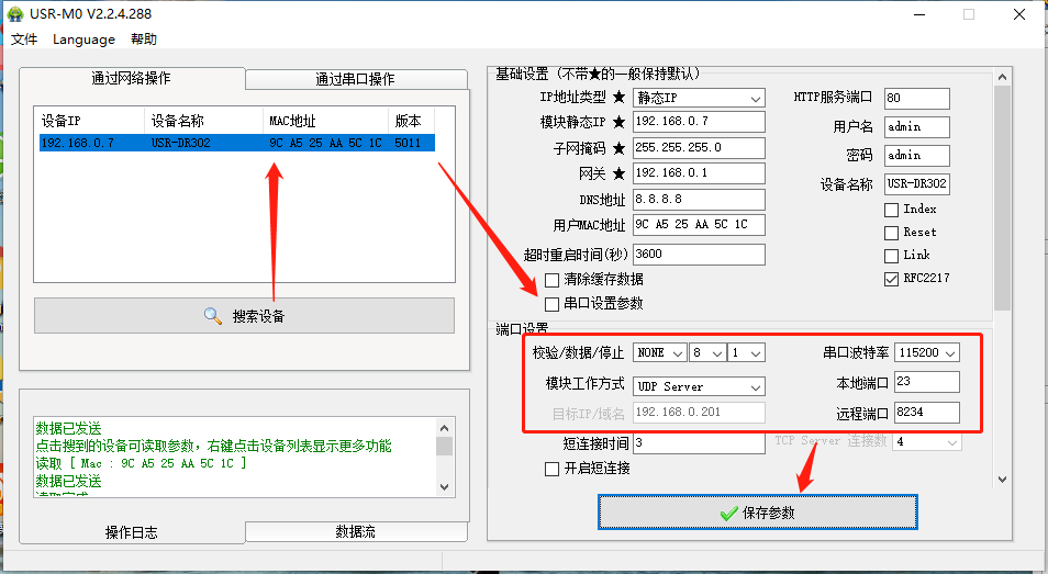 串口端选择正确的串口(可在设备管理器--端口处查看)以及串口参数,302出厂默认115200,N,8,1。
