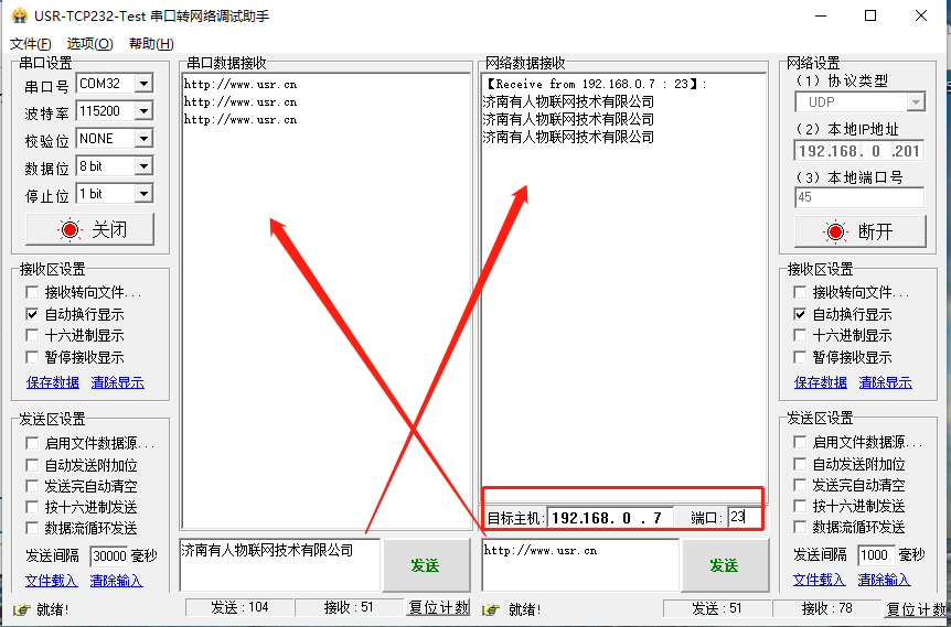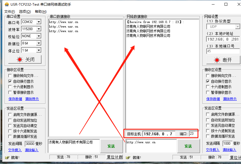 点击“连接”后,需要将目标主机和端口改为301的Ip和本地端口,然后串口往网络发一包数据建立连接后,网络即可往串口发数据。