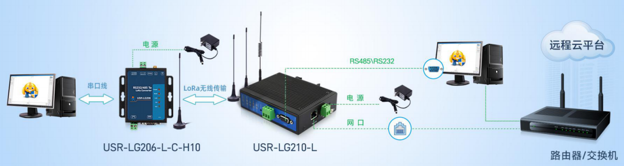 lora网关LG210与lora节点(USR-LG206-L-C-H10)安装天线,使用各自配套电源适配器供电,lora网关 LG210与lora无线终端LG206串口连接电脑,LG210网口连接路由器或者交换机,电脑也接入该路由器或交换机。