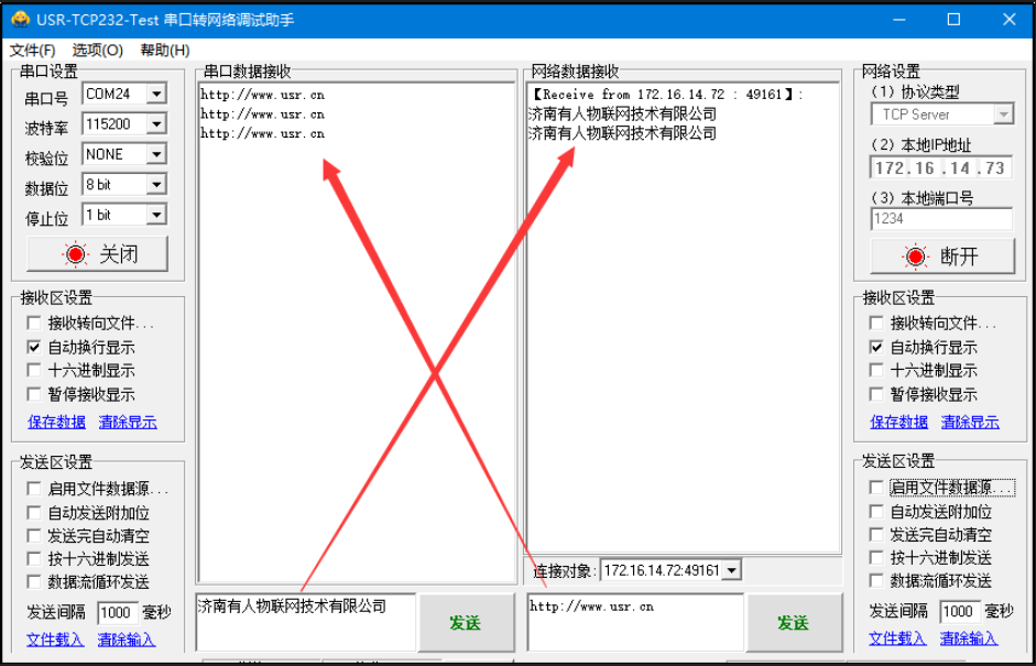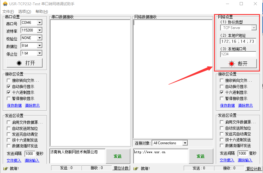 在USR-TCp232-Test软件的串口端打开206的串口, 互发数据便可通信了。