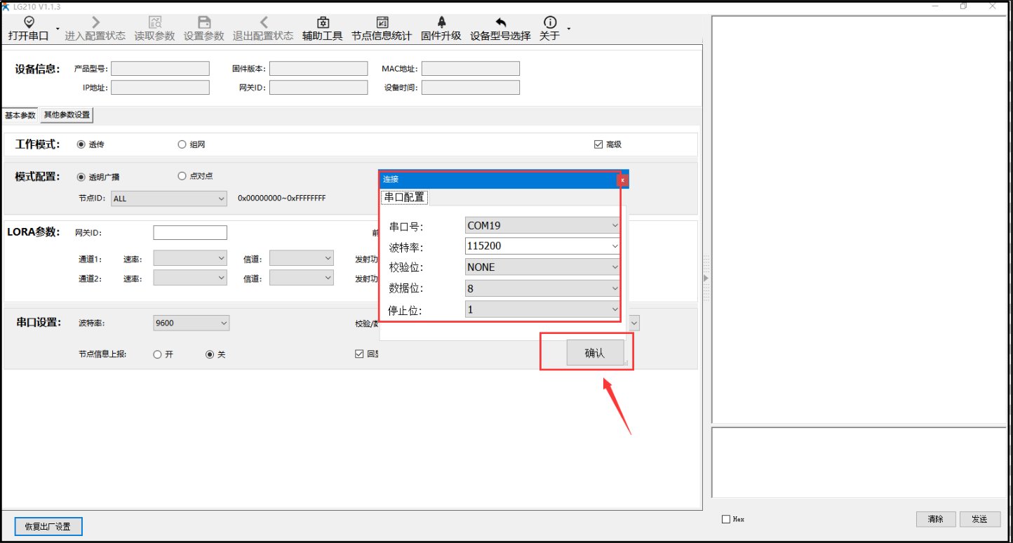 2) 打开设置软件(协议选择私有协议,型号选择LG210),依次点击打开串口(选择LG210对应的串口号,串口参数:115200,None,8,1,NFC)。