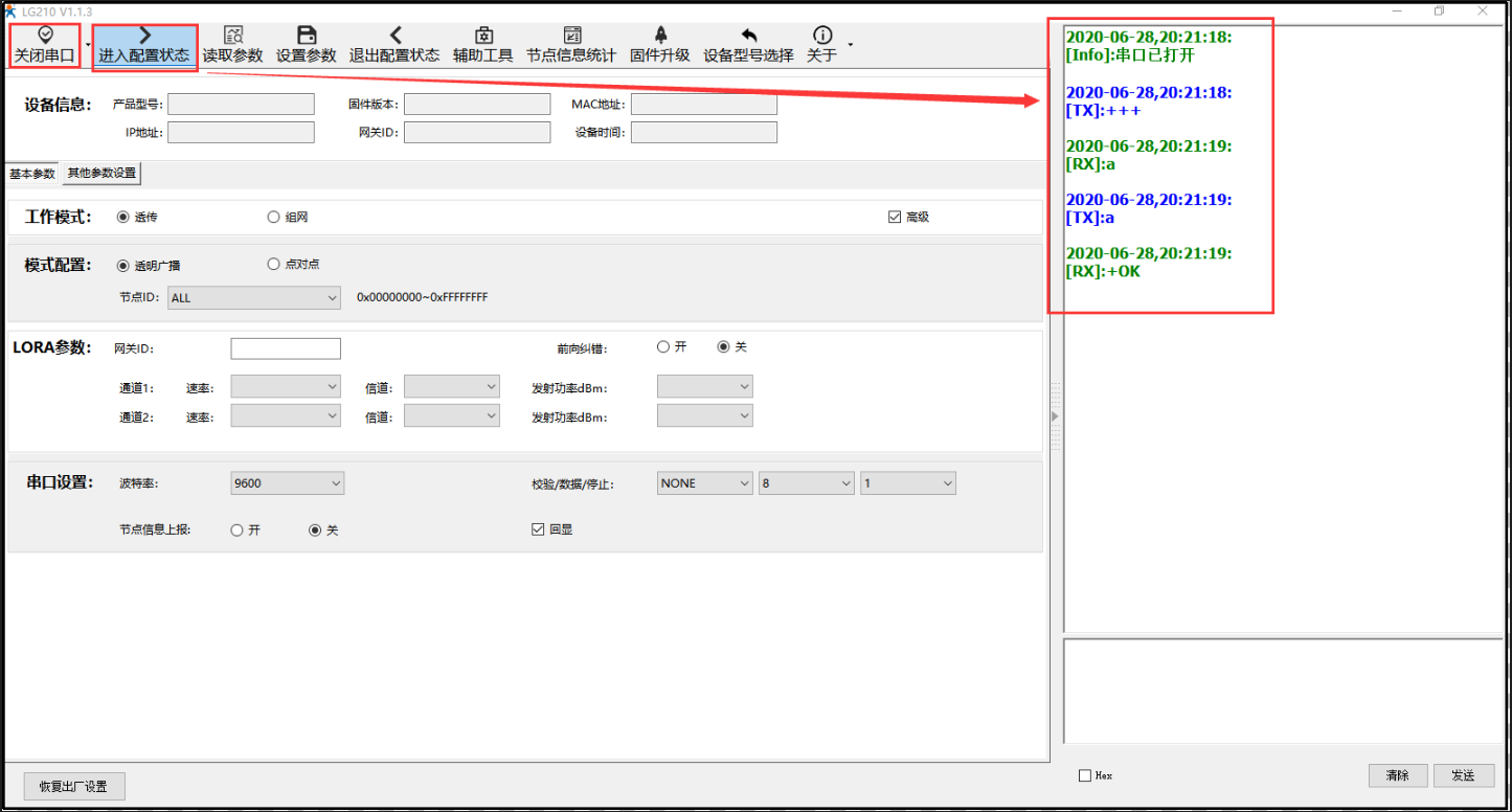 3) 点击进入配置状态,能返回a +OK,说明模块已进入配置模式,在配置模式下才可以读取配置模块参数, 若不返回a+ OK,说明模块没有进入配置模式,检查接线是否可靠稳定,打开的com口对不对,串口参数配置的对不对。