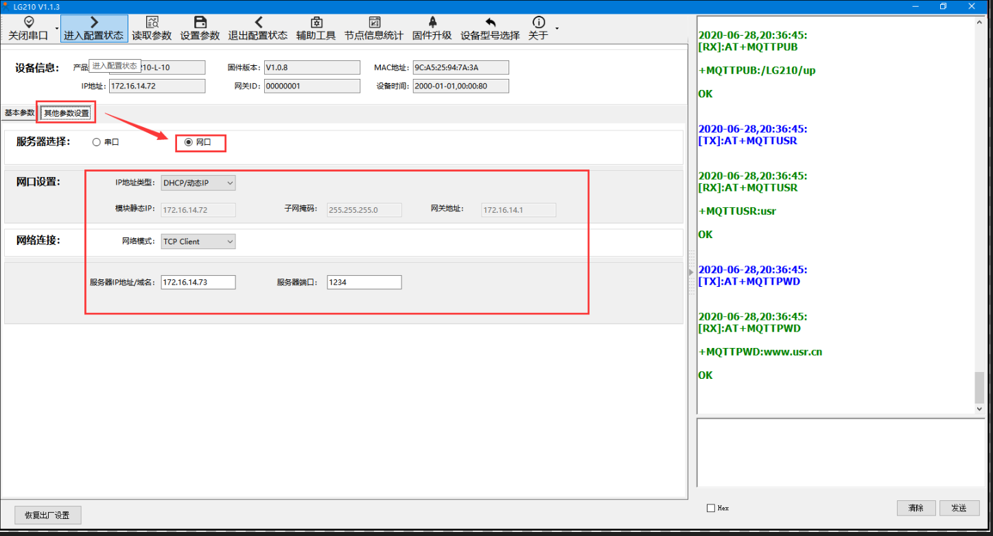 点击“其他参数配置”,服务器选择:“网口”。