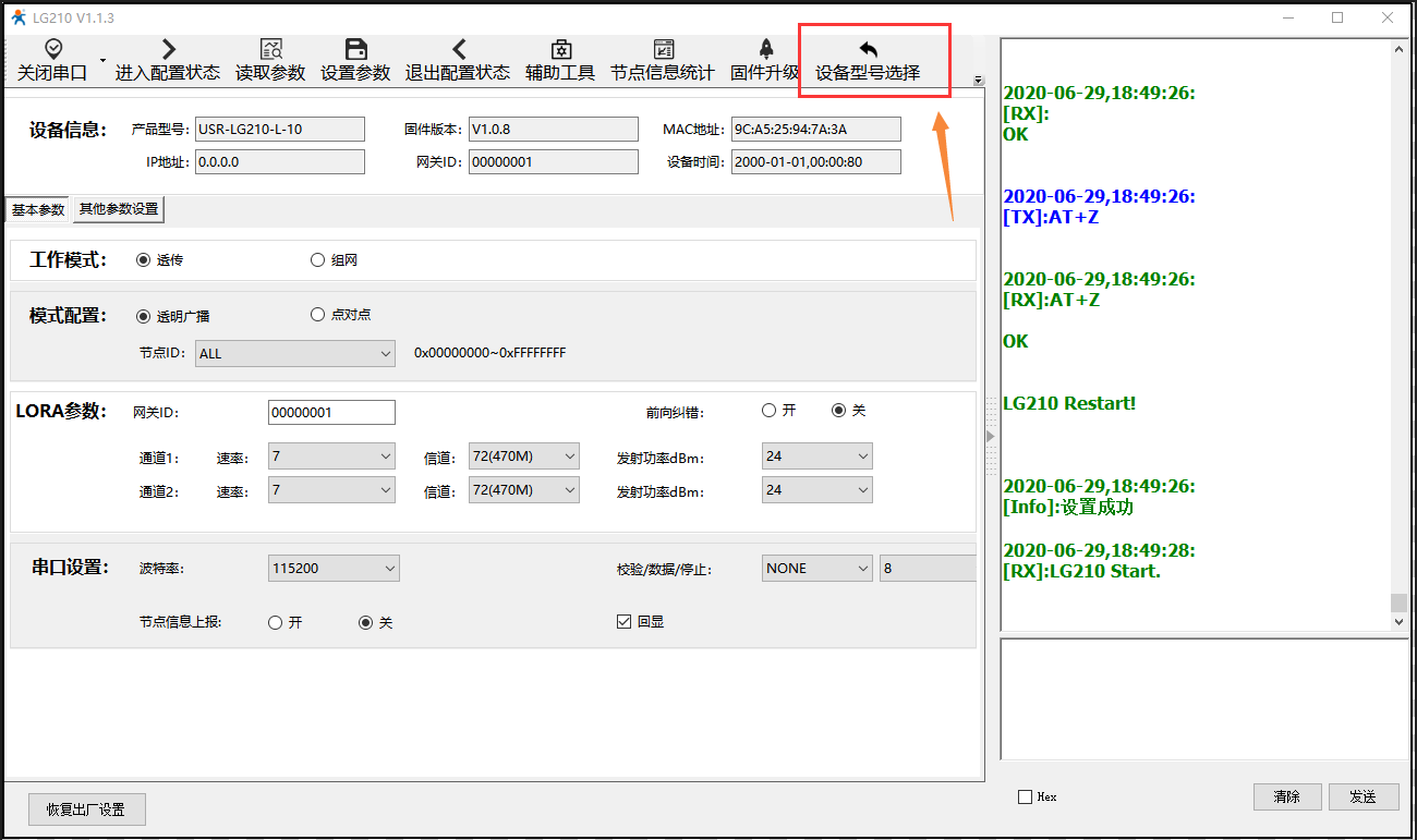 7) 配置LORA节点USR-LG206-L-C-H10,设置软件设备选型选择”LG206-L-p-H10”。