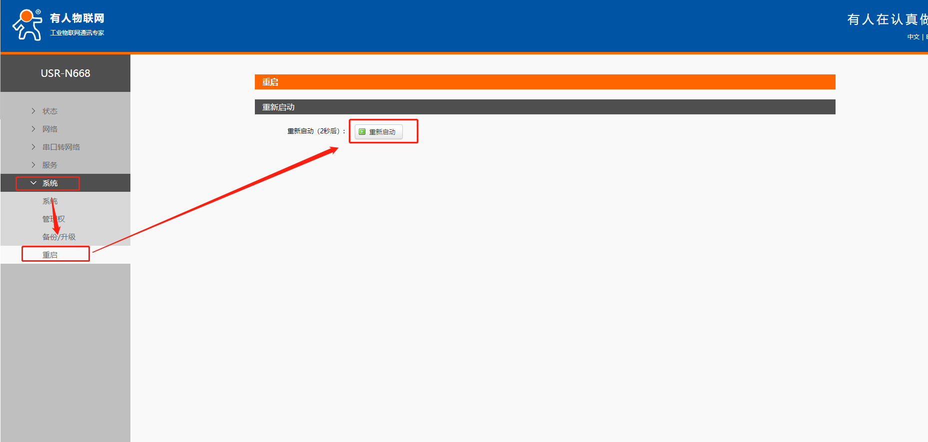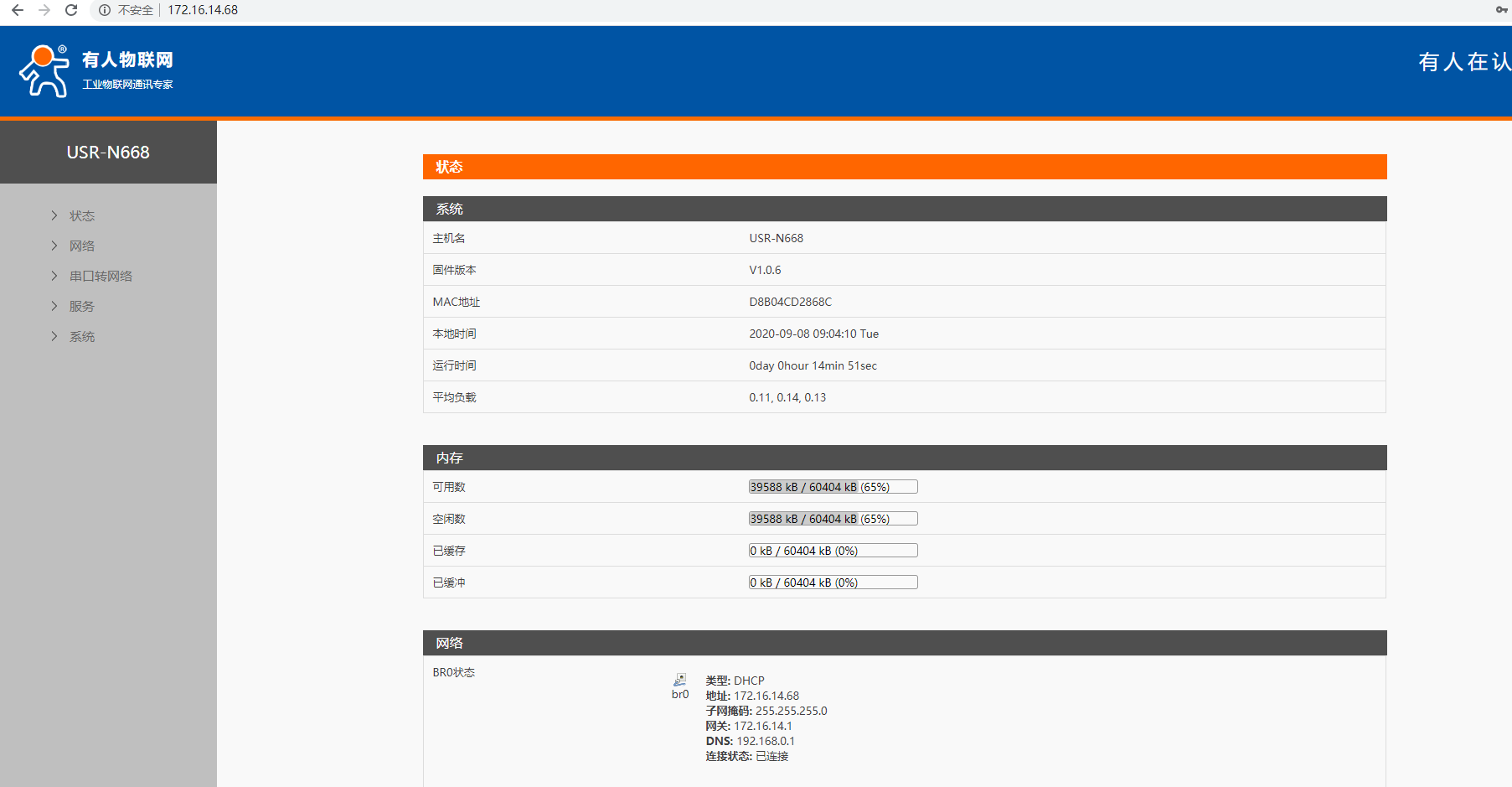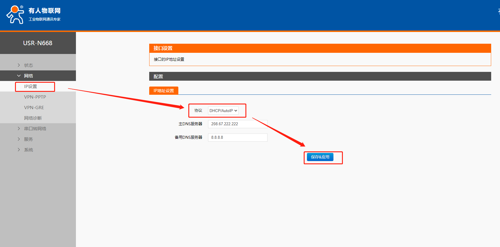 6. 完成重启后,此时的N668使用的是路由器分配的IP,这时将电脑连接N668的网线连接同一路由器,使电脑与N668都使用路由器分配的IP,且都存在于同一网段。可以从路由器中获取N668当前IP,通过此IP进入内置网页,或者通过设置软件搜索当前N668IP。通过新IP进入内置网页。