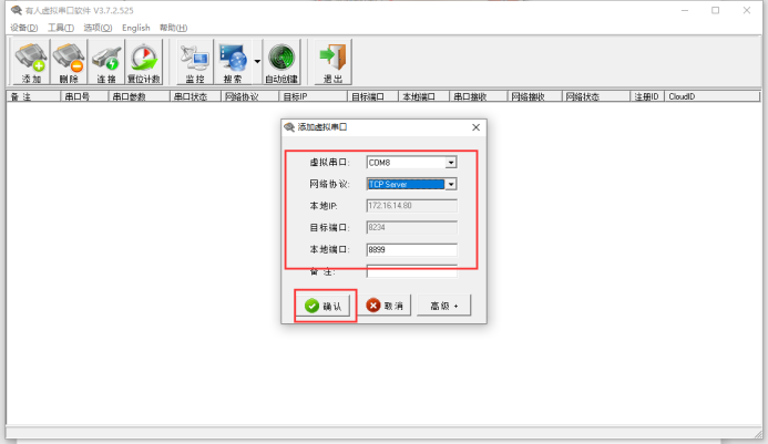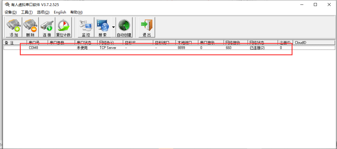 11.使用虚拟串口软件建立TCP Server网络监听(使用时需要将Test调试助手软件创建的Server监听关闭,不能同时使用),且串口必须为未被占用的串口号。
