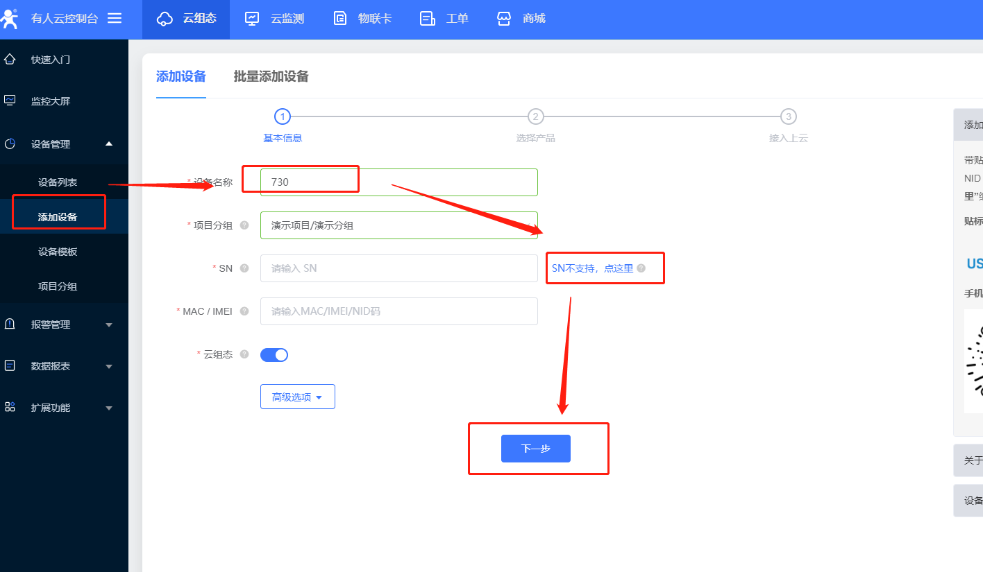 (2) 730目前不支持SN码添加,点击右侧“SN不支持,点这里”,设备ID和通讯密码可以自动生成,设备ID20位,通讯密码必须是8位(支持修改密码)。