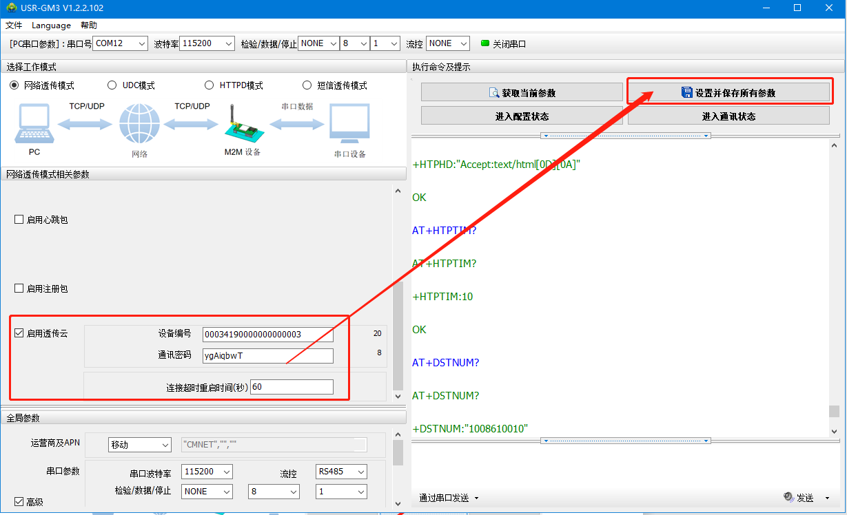 6、启用注册包类型选择透传云,设备编号和通信密码为在云平台添加设备生成的设备编号和通信密码,点击确定设置所有参数。