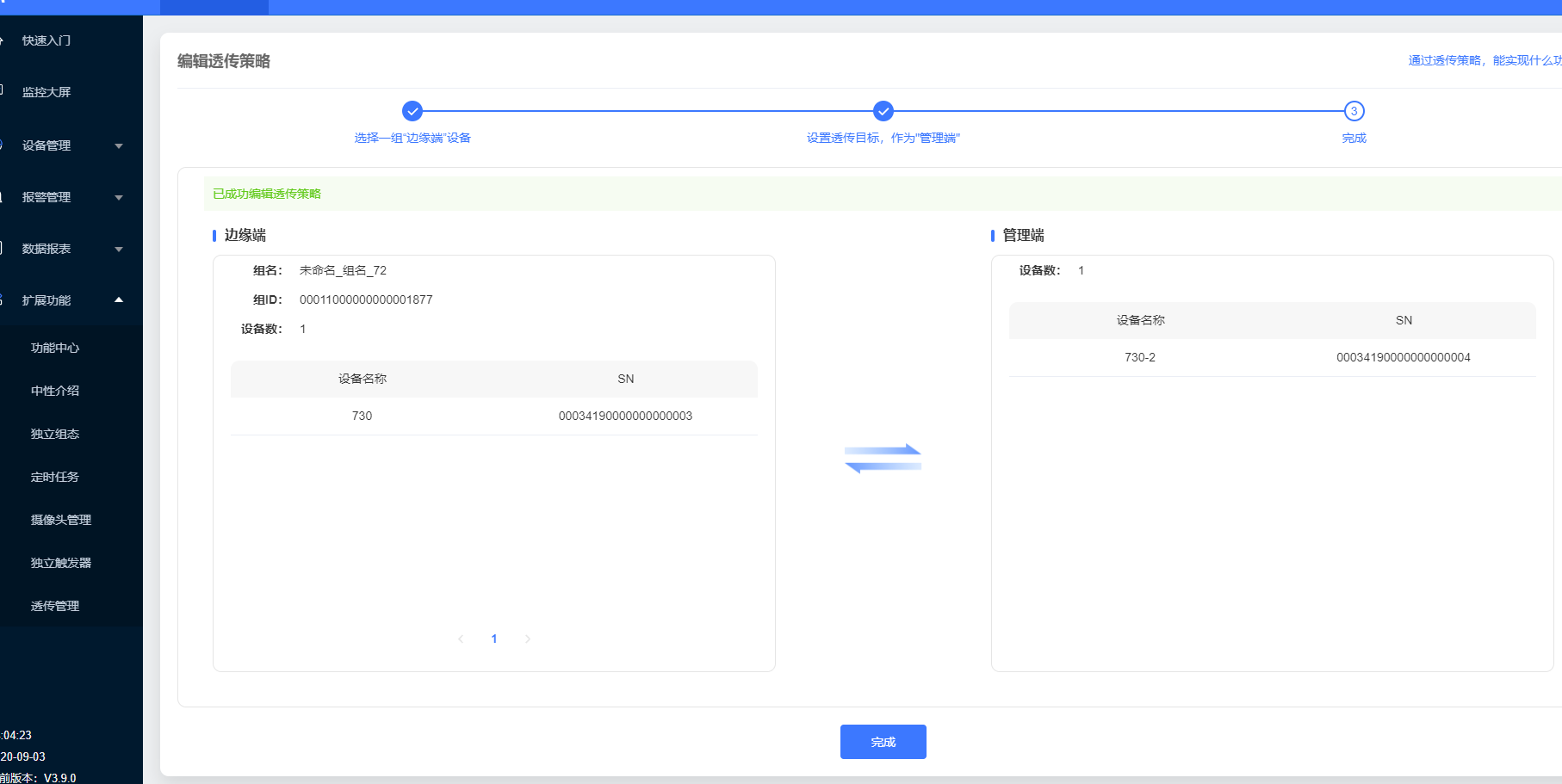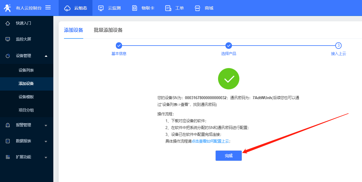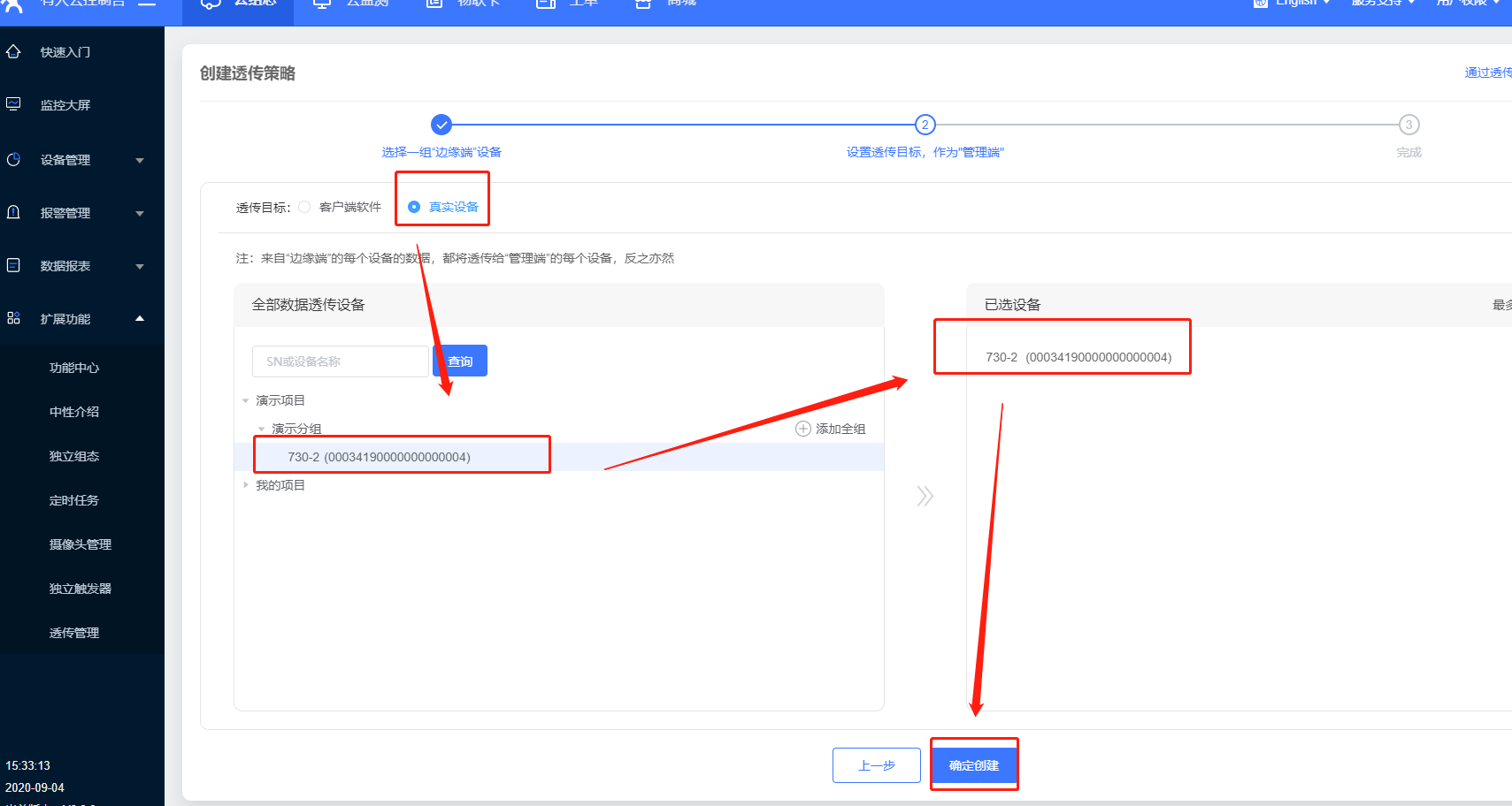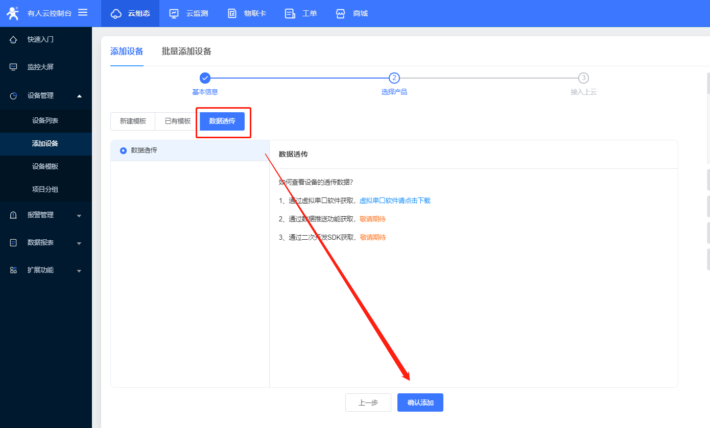 3、选择数据透传,点击确认添加,则设备添加成功。
