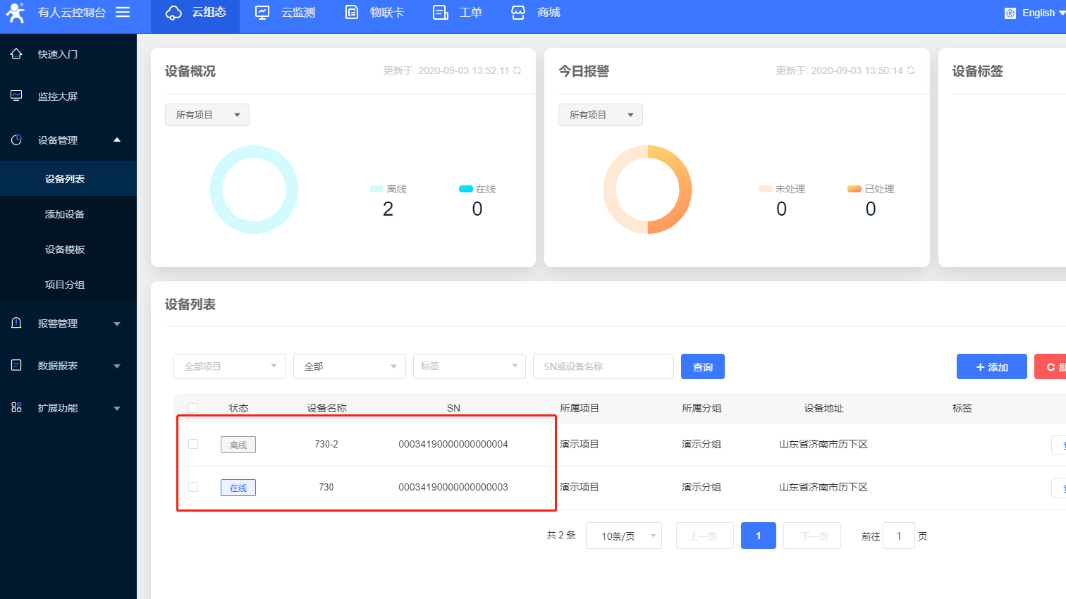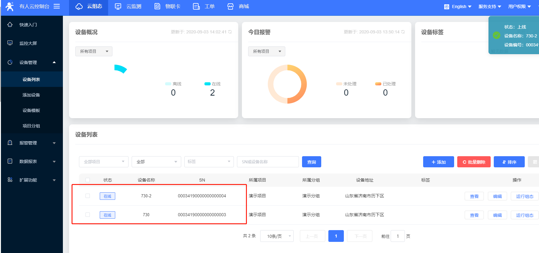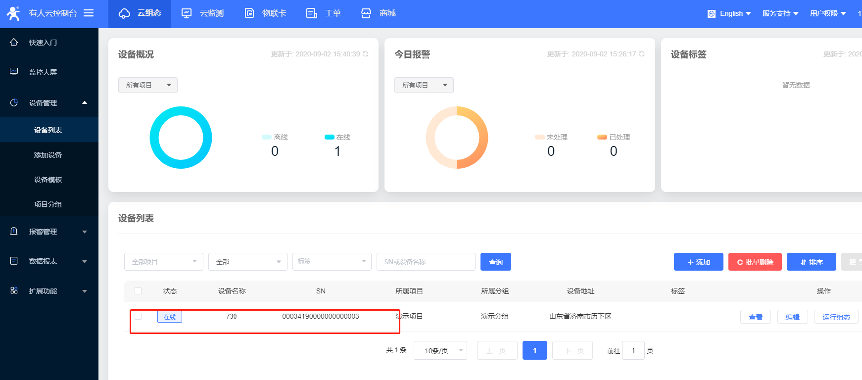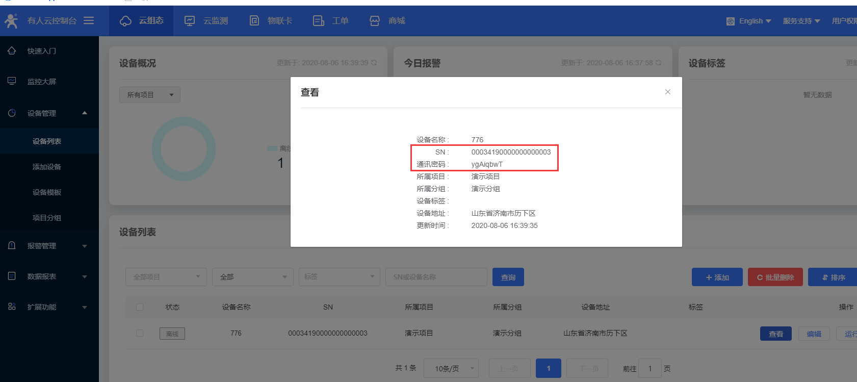 (2) 730目前不支持SN码添加,点击右侧“SN不支持,点这里”,设备ID和通讯密码可以自动生成,设备ID20位,通讯密码必须是8位(支持修改密码)。