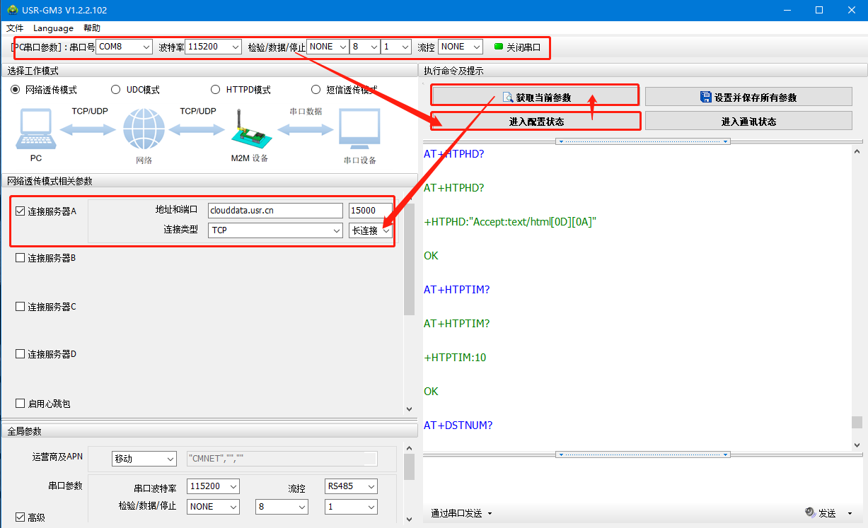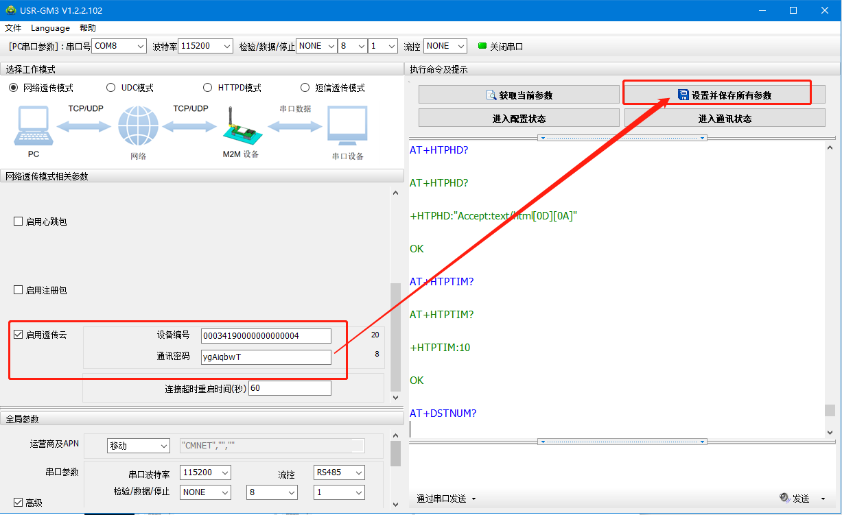 5、连接服务器A,地址和端口号填写:clouddata.usr.cn,15000,启用注册包类型选择透传云,设备编号和通信密码为在云平台添加设备生成的设备编号和通信密码,点击确定设置所有参数。