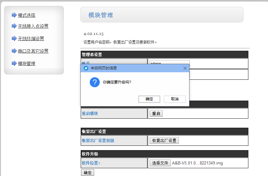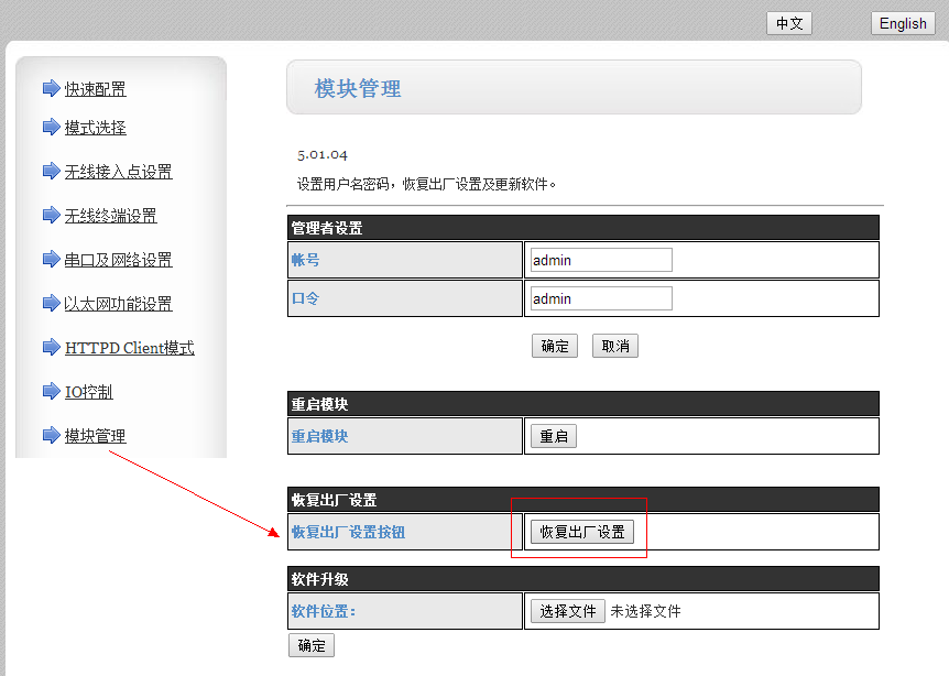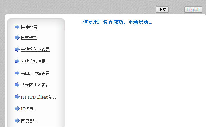 5:刷新页面后显示升级后的页面,然后点击“模块管理” 的 "恢复出厂设置"