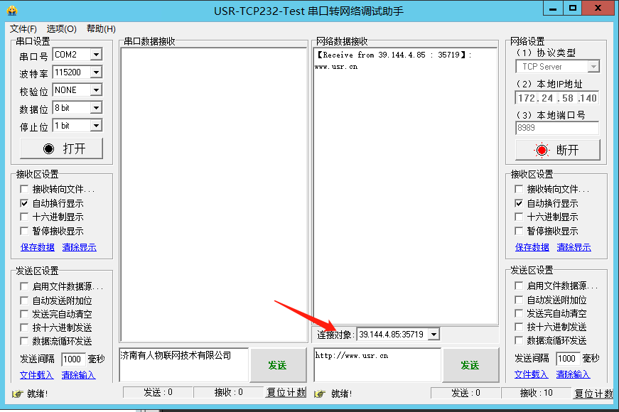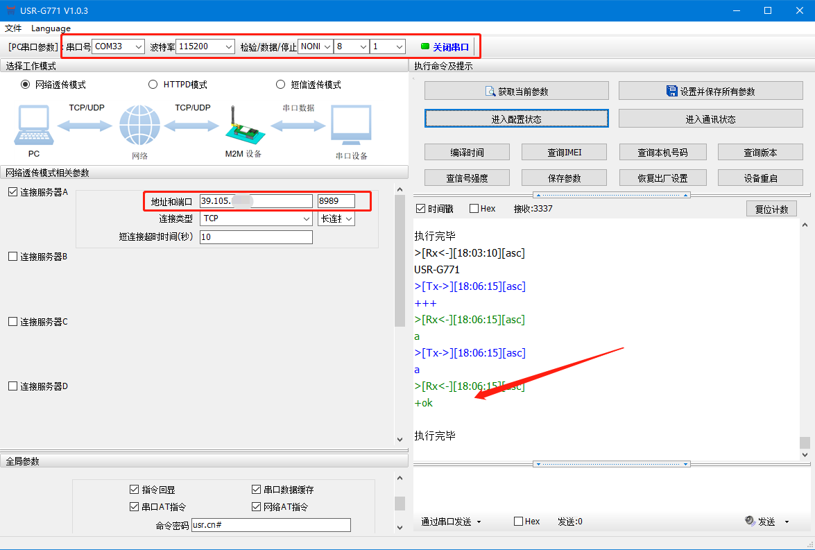 注:点击进入配置状态,如果模块能返回+ok的字符,说明电脑和模块连接是没有问题的