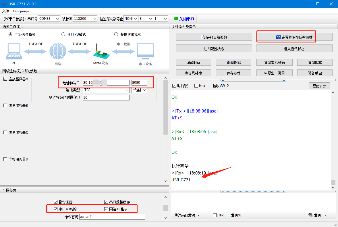 (2)打开串口——进入配置状态——设置相关参数——设置并保存所有参数——串口打印开机信息说明重启成功