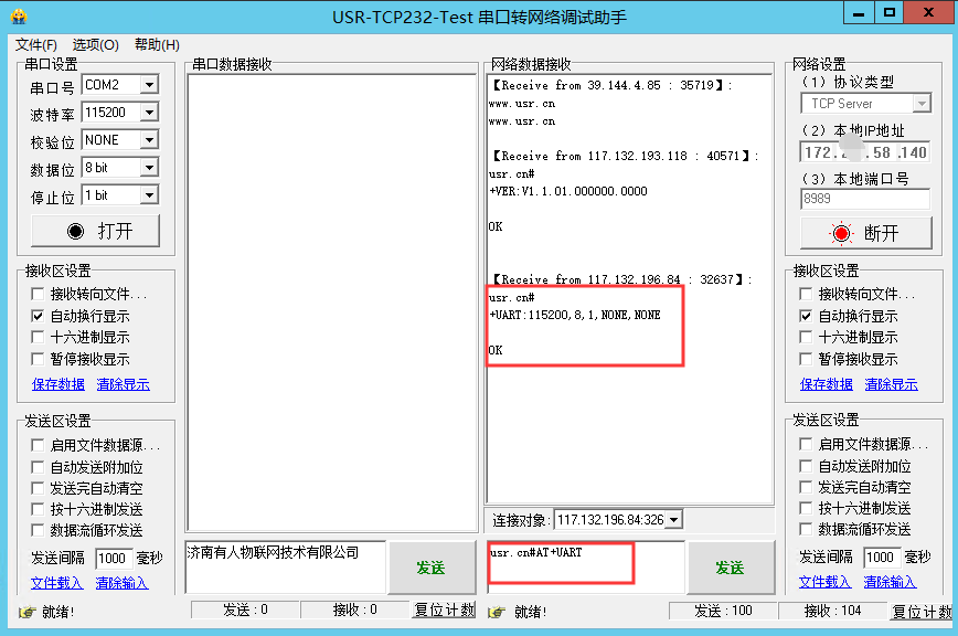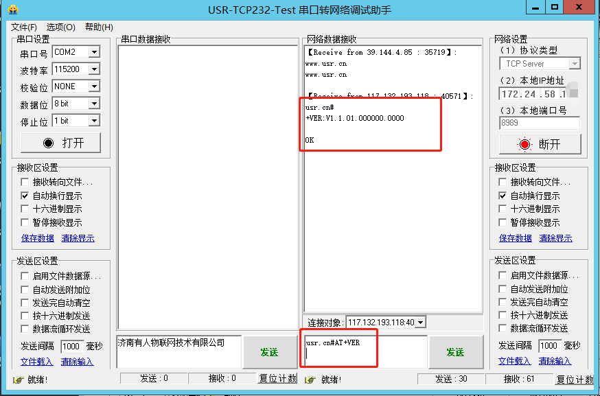 (4)查询版本:在串口发送usr.cn#AT+VER+回车换行 可以看到模块返回固件版本号