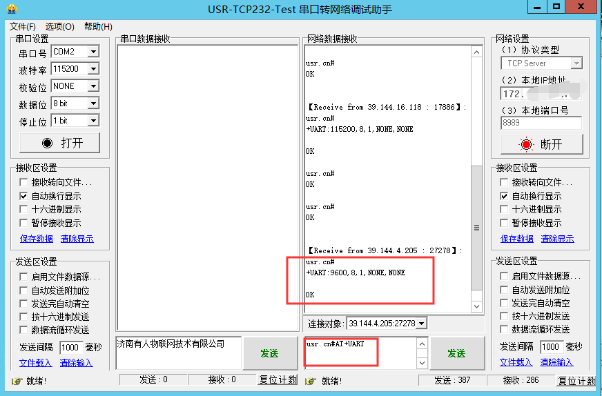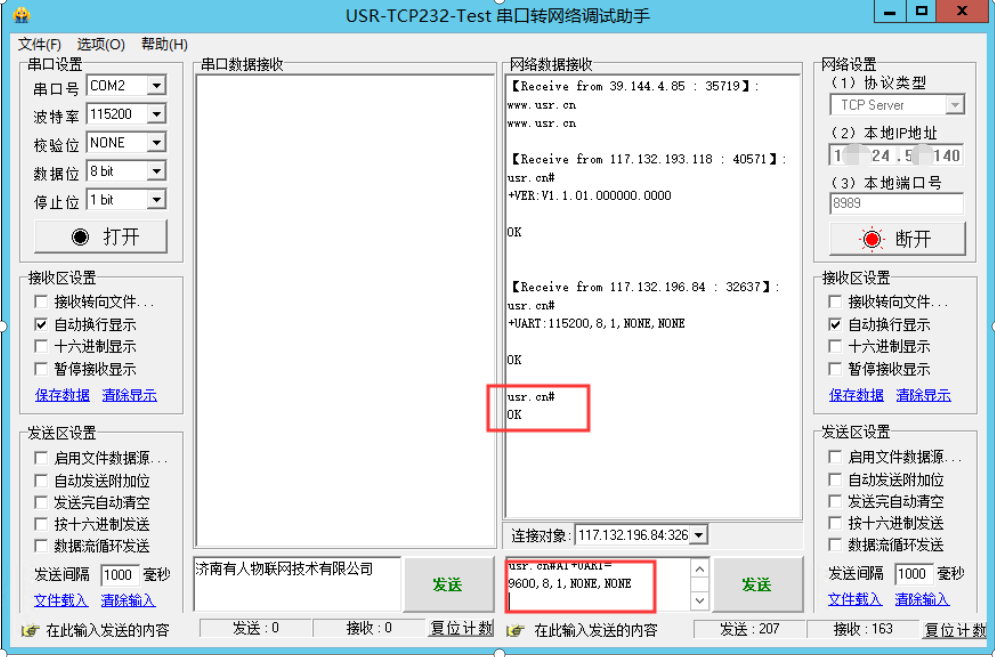 (7)更改以后发送usr.cn#AT+S+回车换行 重启以后参数保存成功;然后重新建立连接以后查询串口参数,可以看到串口波特率已经变为9600