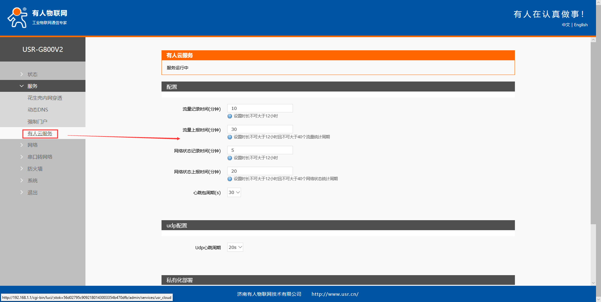 2、V1.0.24以上固件默认开启有人云服务功能。界面可以配置统计流量、网络状态、心跳包的上报参数;同时支持数据上报到私有部署的有人云服务器地址