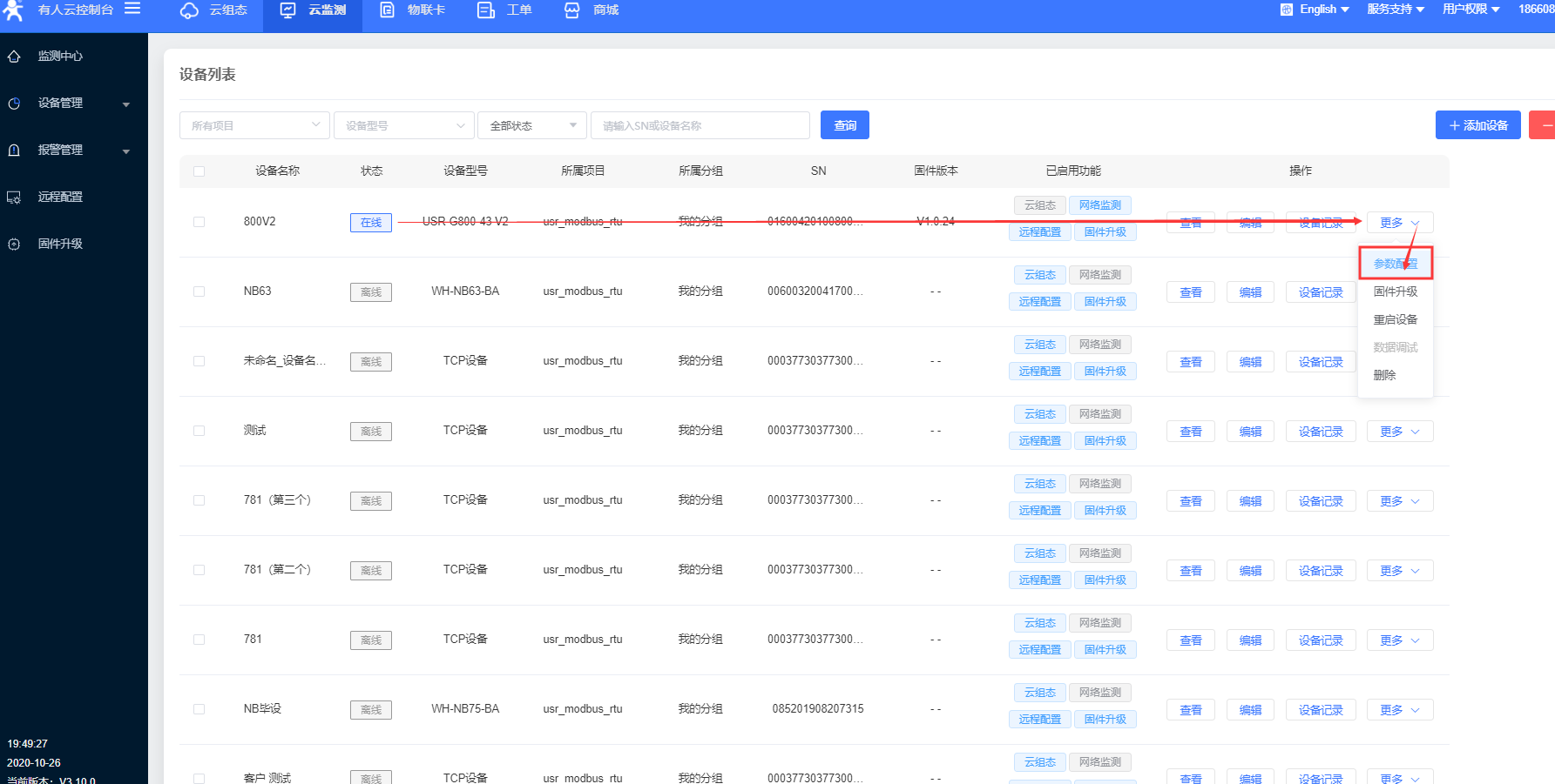 在“云监测”的“设备列表”下,找到想要进行参数配置的设备,点击“更多”,选择“参数配置”