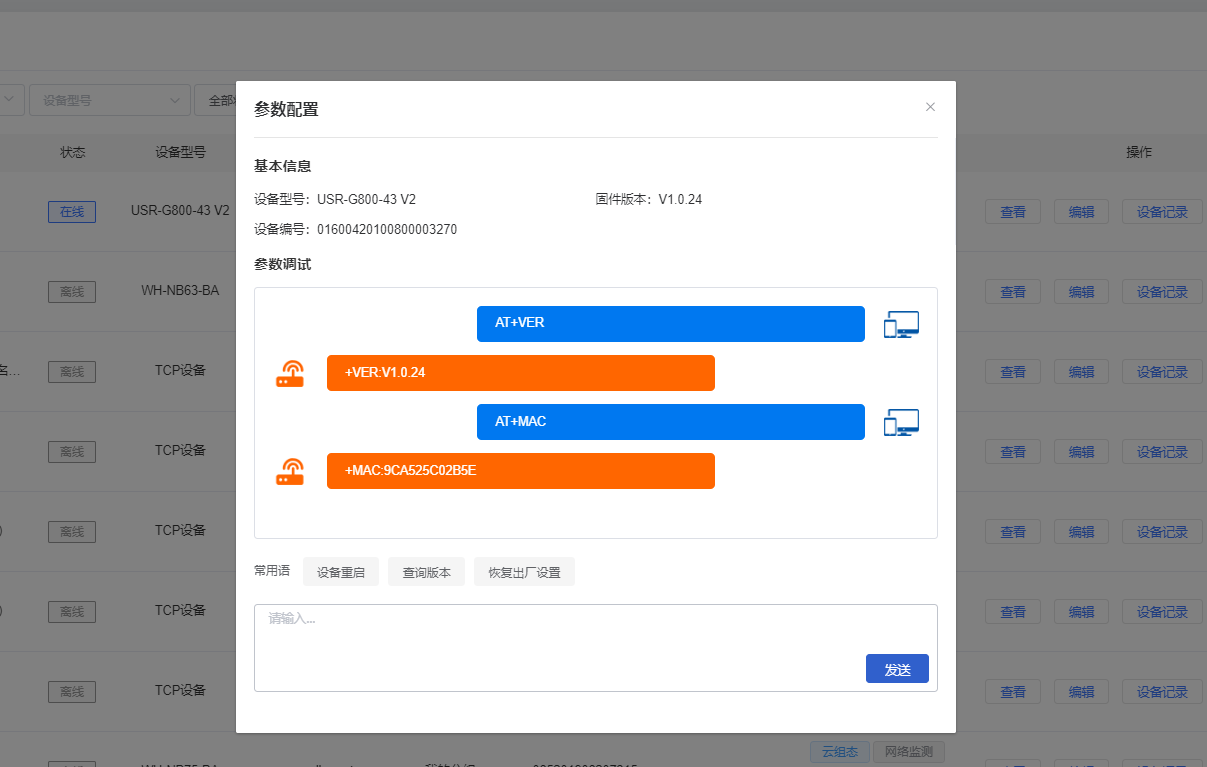 在参数配置界面,可以输入指令来进行配置设备的某些参数,或者读取设备的某些参数,并且参数的返回也会显示在平台上面