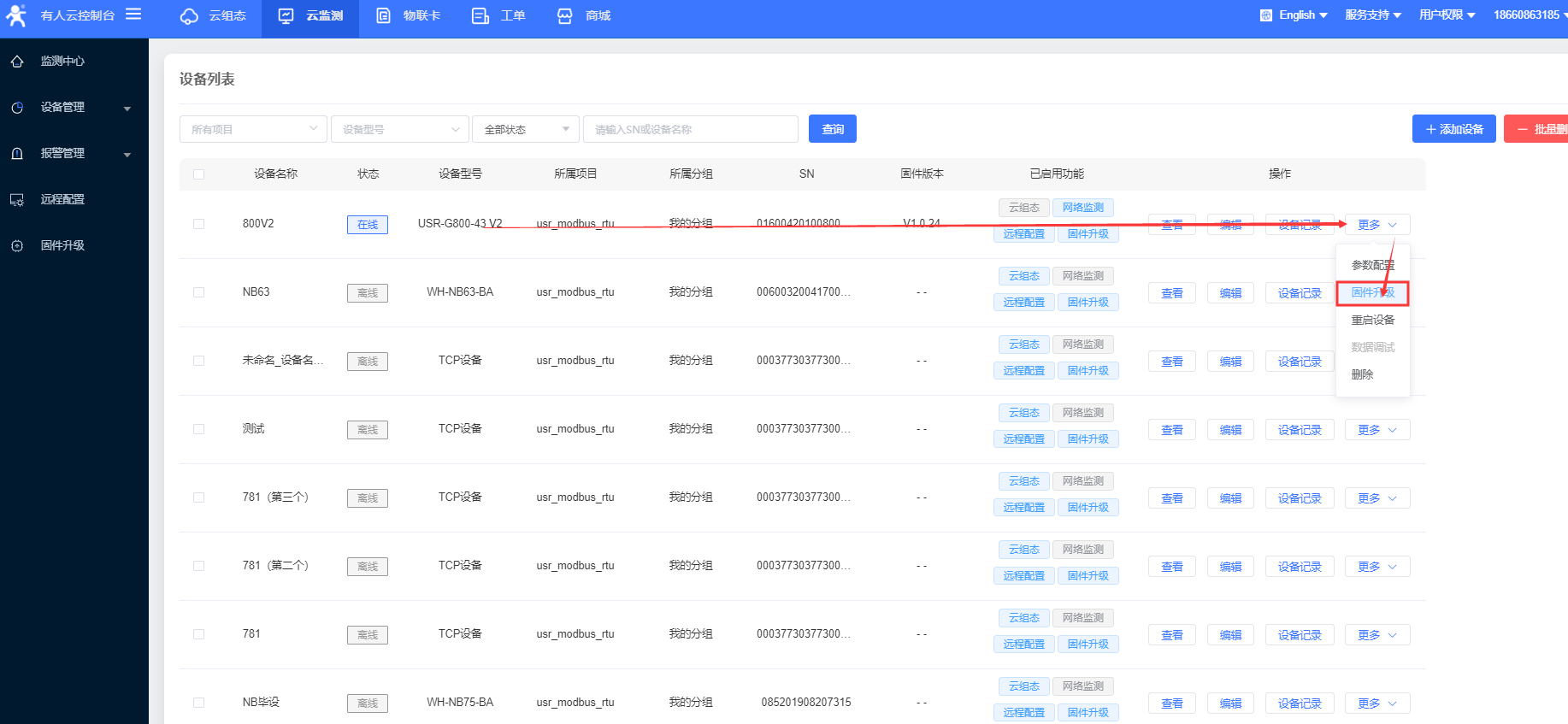 在“云监测”的“设备列表”下,找到想要进行固件升级的设备,点击“更多”,选择“固件升级