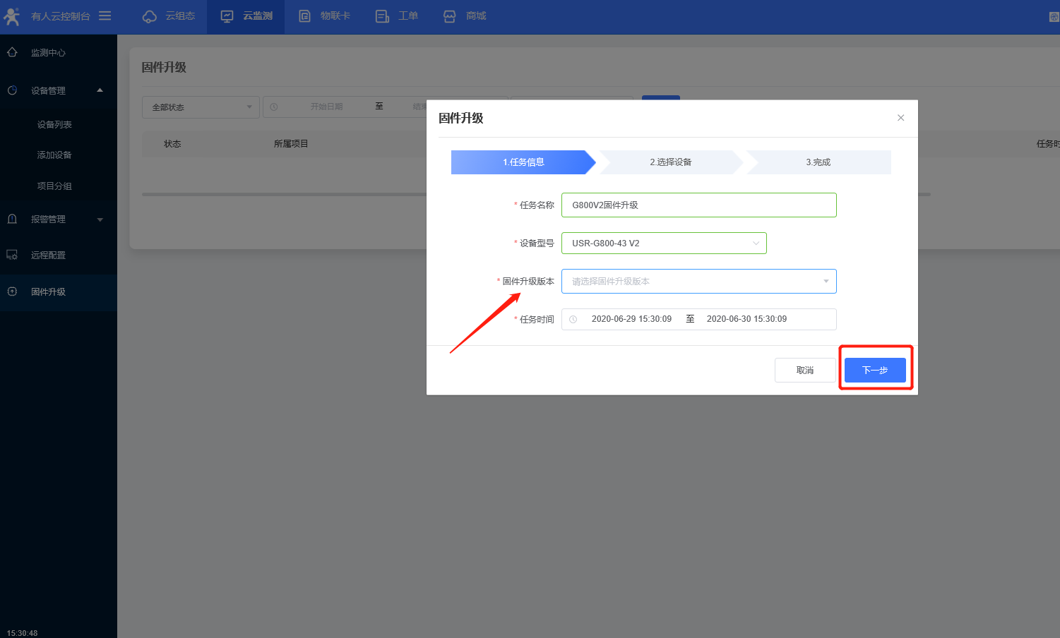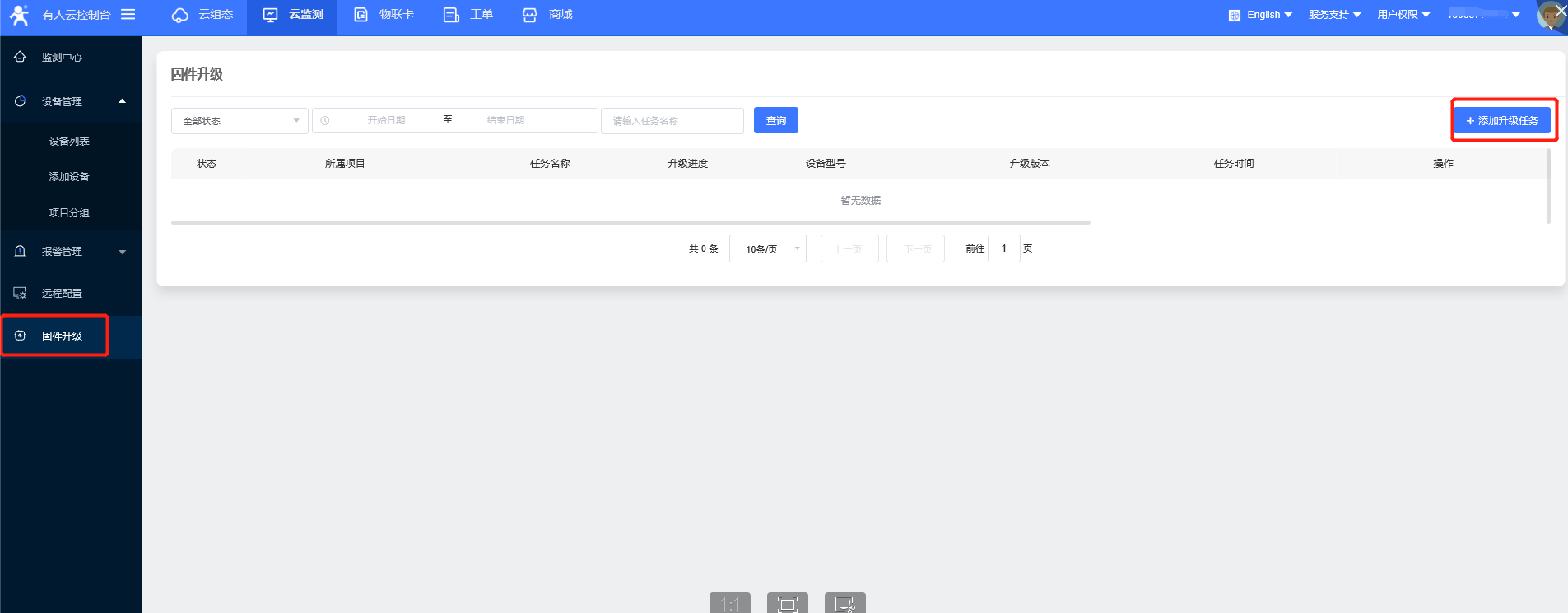 也可以在在“云监测”的“固件升级”下,点击“添加升级任务”。