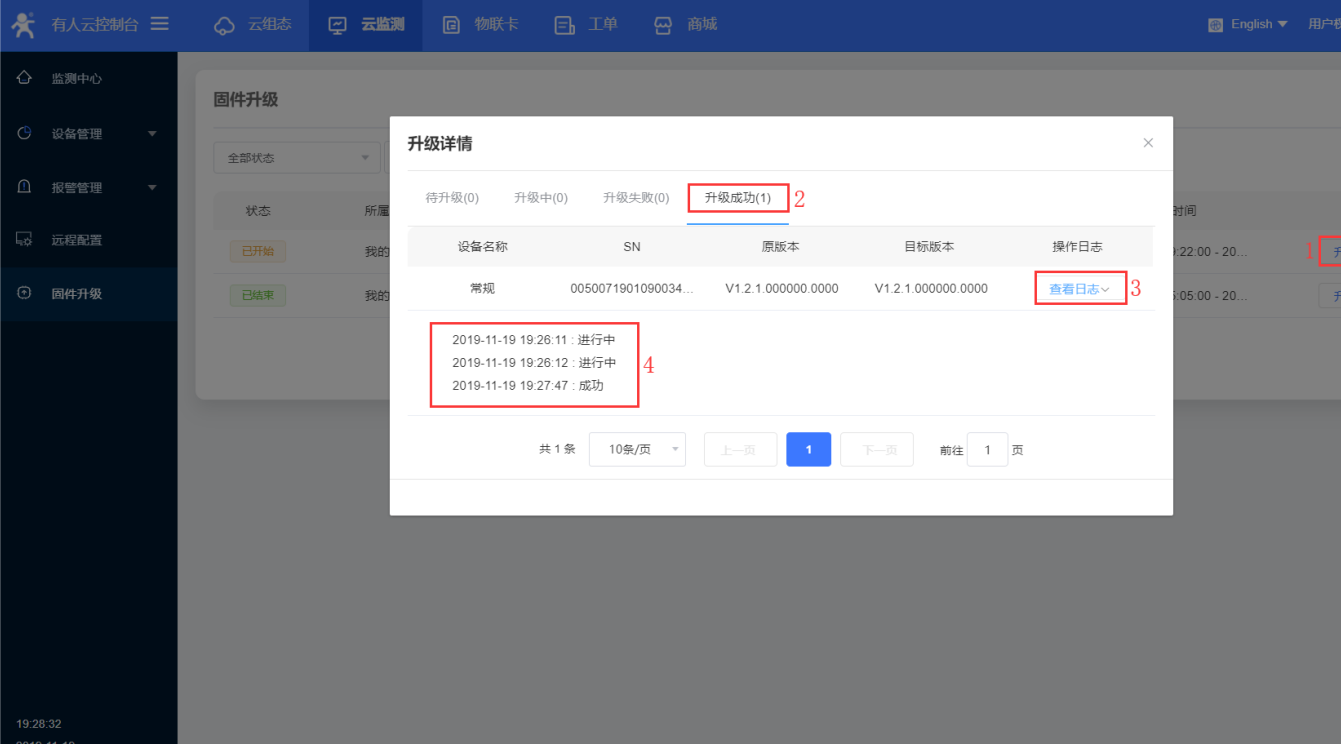 在“升级详情”里面查看当前固件升级进度,并且可以在“查看日志”里面查看详细信息。
