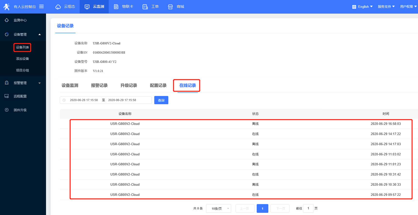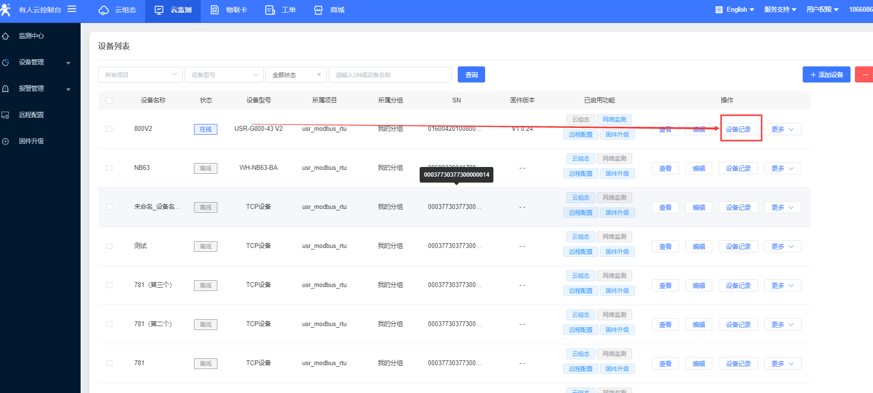 在“云监测”的“设备列表”下,找到相应设备,点击“设备记录”,页面会显示当前设备历史信息