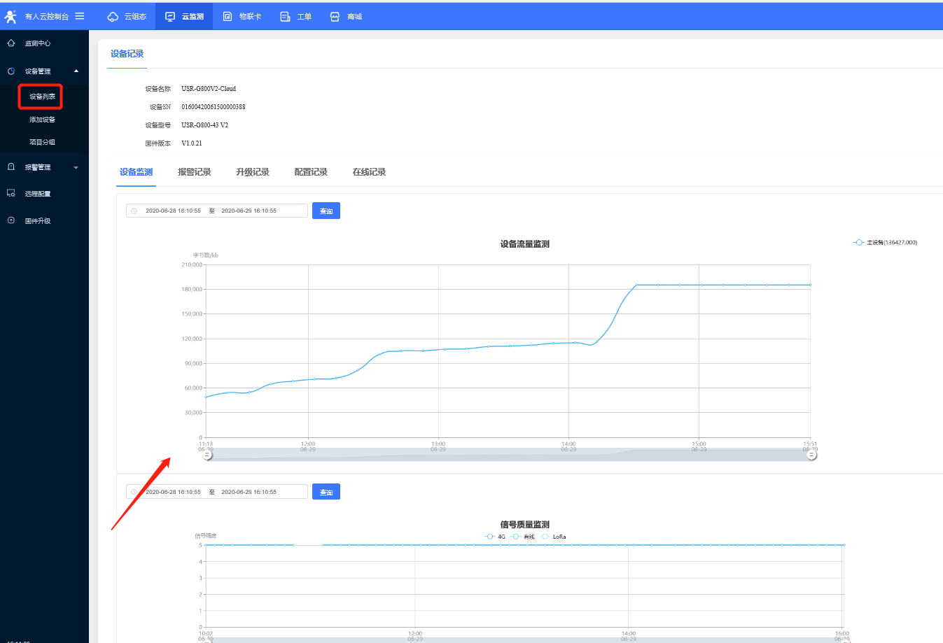 在“设备监测”一栏可以看到设备某个时间段的流量曲线、信号曲线