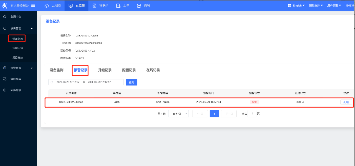 在“报警记录”一栏可以看到设备某个时间段的报警记录,需先在设置报警参数才会有报警记录,比如频繁下线告警、信号强度过弱报警