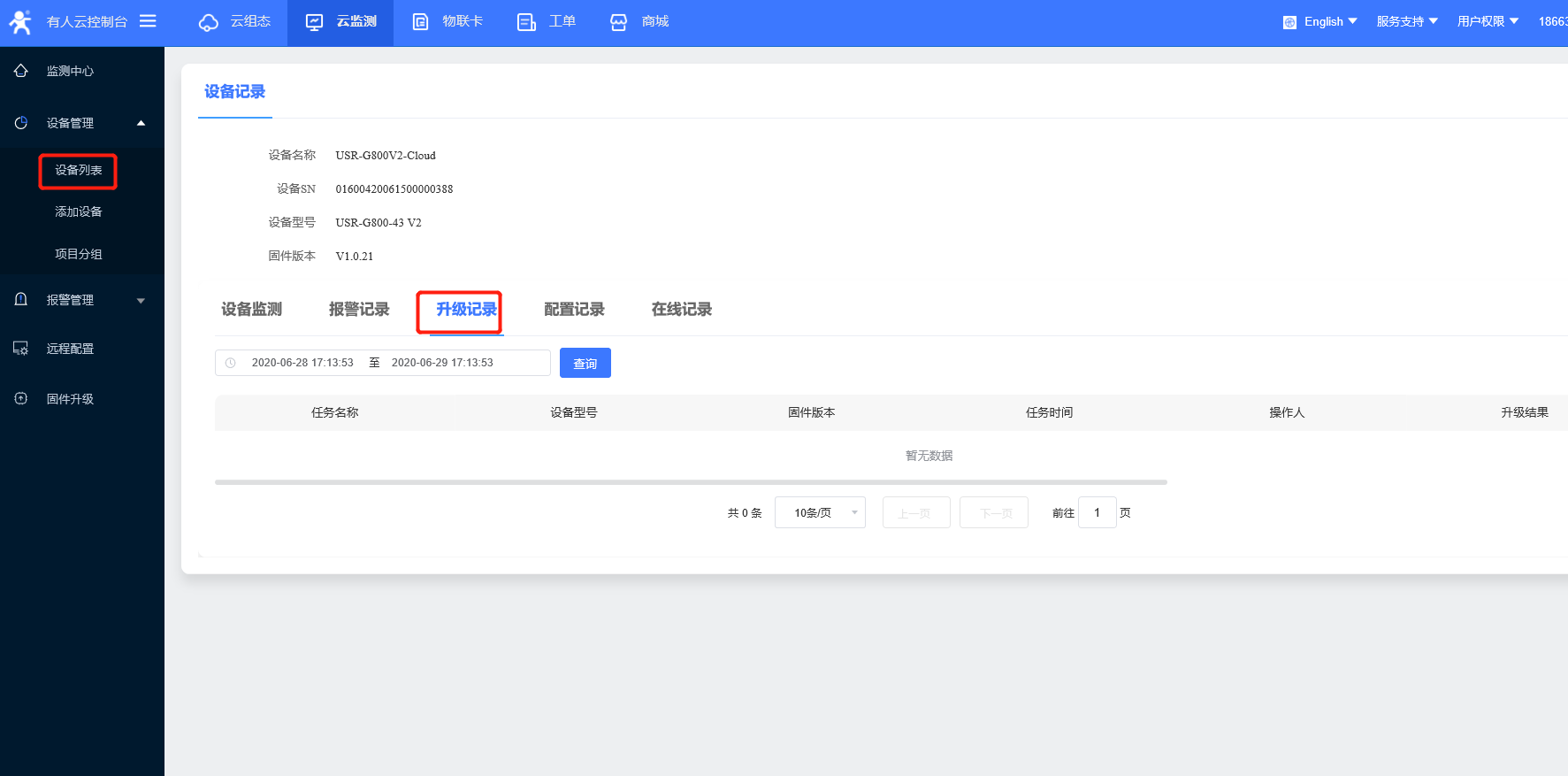 在“升级记录”一栏可以看到设备在某个时间段有没有进行过固件升级。由于当前设备没有进行过升级,所以没有记录