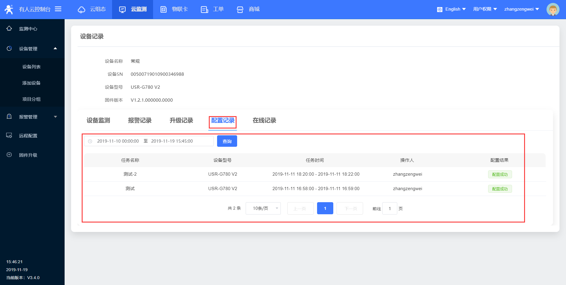 在“配置记录”一栏可以看到设备在某个时间段的远程配置任务的执行情况
