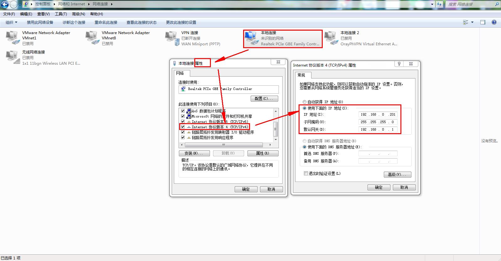 电脑打开控制面板,只保留本地连接网卡,禁用其他网卡。本地连接右击属性,找到IPv4,将IPv4的参数设置静态IP,192.168.0.201,子网掩码255.255.255.0,网关192.168.0.1