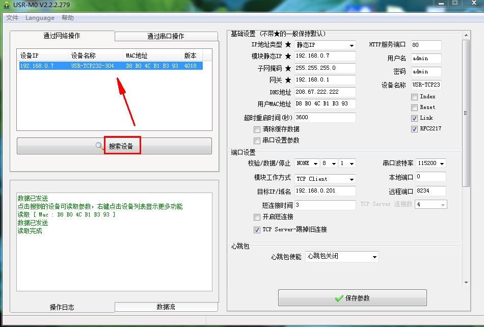 用M0设置软件搜索设备,获取304 的IP参数