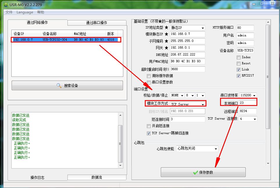 点击304的IP,将304 IP设置192.168.0.7,工作方式TCP server,本地端口23
