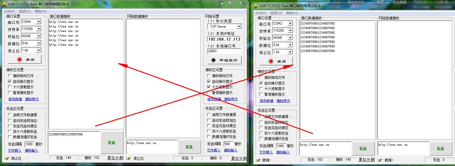 电脑用串口助手打开2个304的COM口,用对应304的串口参数,然后进行数据传输。