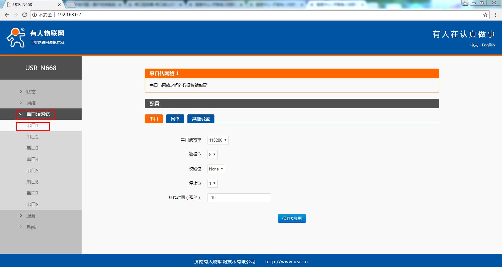 用USB-RS232串口线接电脑和USR-N668的232转接头。拨码开关拨到232位置。