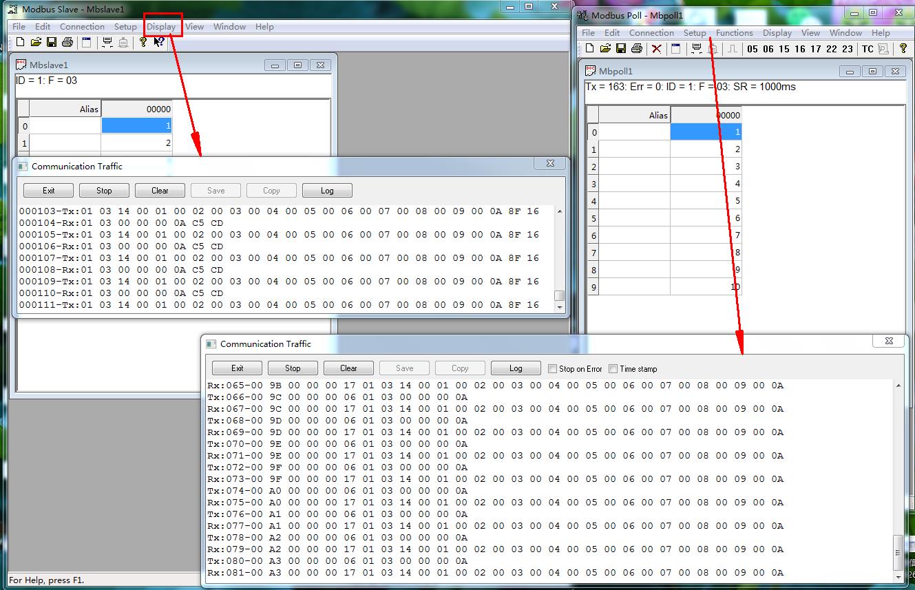 MODBUS SLAVE软件改变从机ID 1 的寄存器地址0-9的内部数据,MODBUS POLL软件对应读取从机寄存器数据。