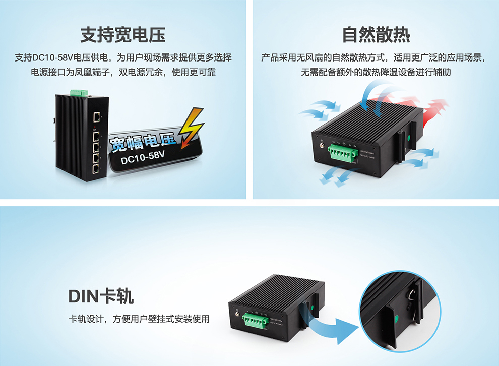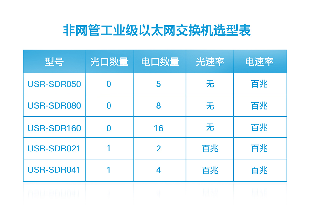 产品分为电口型、电口+光口型两类,提供RJ45标准网口及光纤接口供用户选择