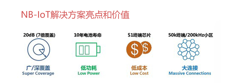 从功耗和性能上看,基站覆盖范围广,终端以低于 2G 的功率即可接入网络;维持网络接入的开销减少;终端工作在低功耗模式下,如采用节能模式可使得99%的时间里功耗只需15微瓦;芯片采用低功耗。对于户外应用的位置跟踪(老人、动物、非机动车)的应用,电池可以使用2-5年。对于资产定位,如农林、环境、能耗数据采集与监测,电池可以使用5-10年。和 2G 相比,NB-IoT 能实现多达 20dB 以上的增益,使得 NB-IoT 网络能够覆盖更广、更深,并有能力覆盖到地下停车场、地下管网。