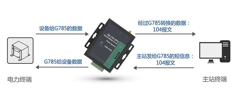 配电自动化的DTU传输设备,可通过4G蜂窝网络联网,远程传输现场数据,操作人员在控制室中进行远程监控数据即可。比如有人科技研发的专为电力行业打造的DTU设备USR-G785,支持电力101/104协议传输。它的工作原理是按照电力104协议传输数据,DTU作为子站端的一部分,只需将数据通过串口发给DTU,G785就会将104报文发送给服务器。